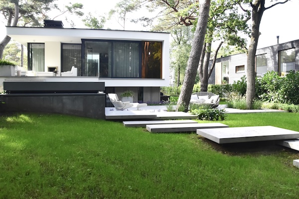 Moderne tuin bij moderne villa in het bos